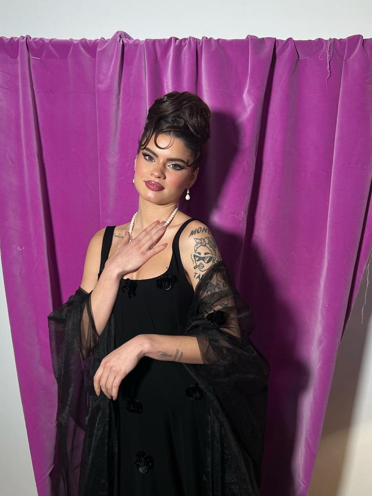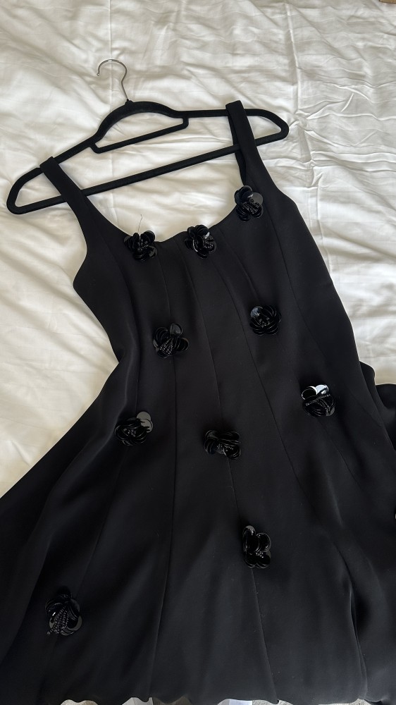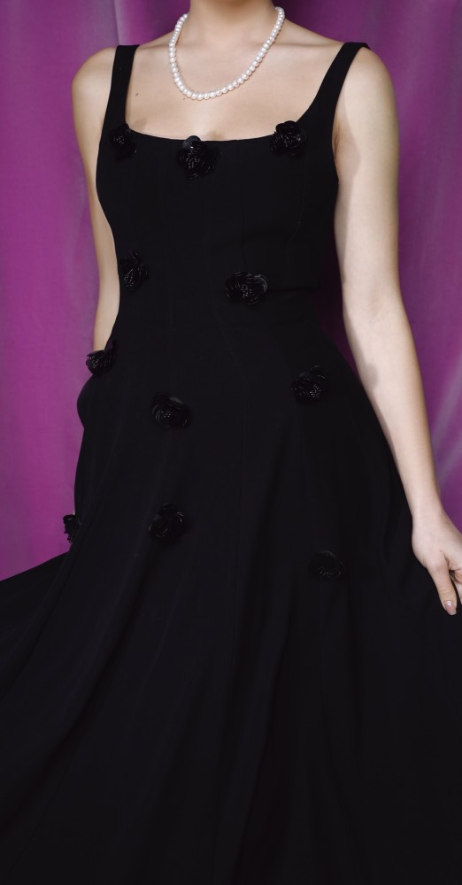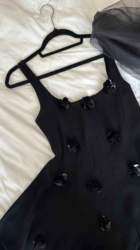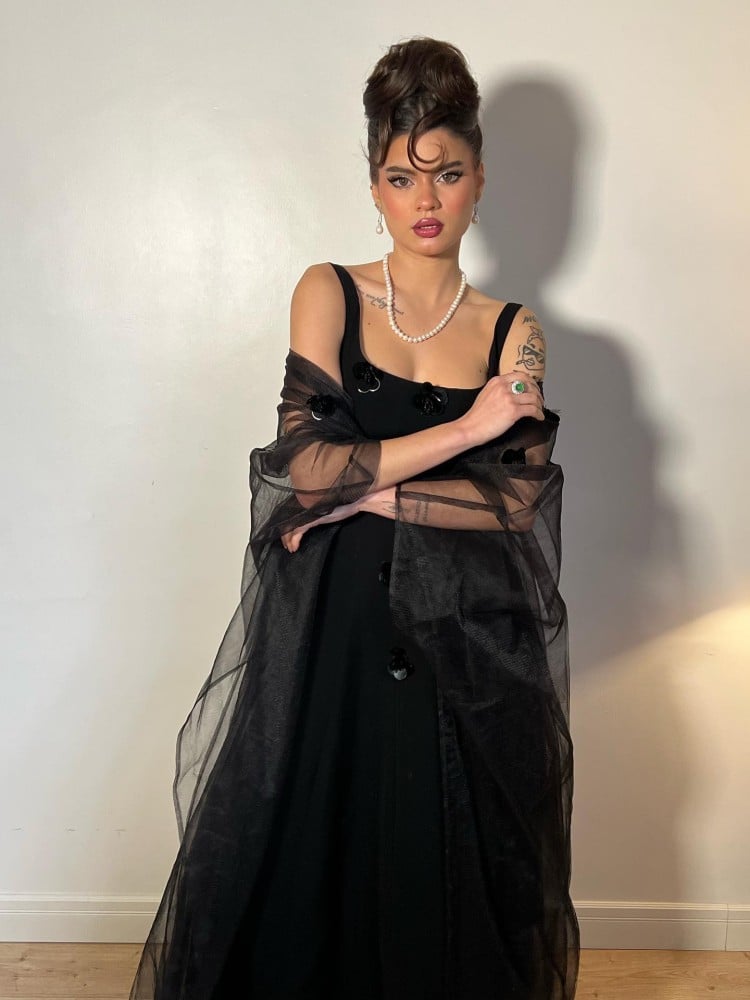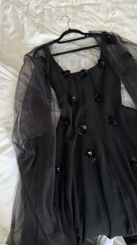 يجمع هذا التصميم بين الأناقة والأنوثة بطريقة مدهشة، حيث يتألف من قطعتين: فستان أنيق ينساب برقة على جسدك، وطبقة من التُل الأسود تضفي لمسة من الغموض والجاذبية.