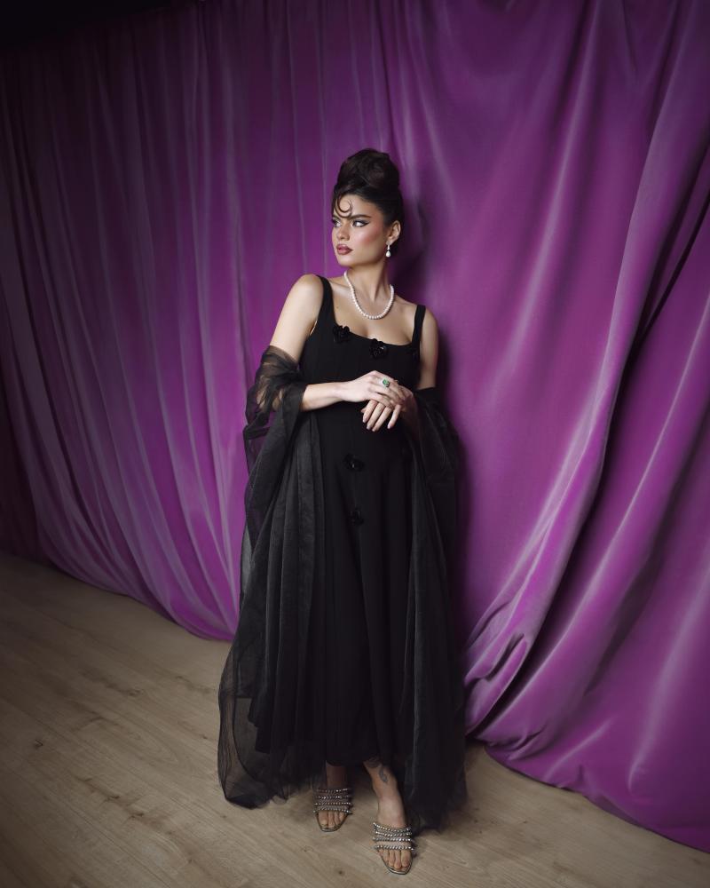 - التُل الأسود يضيف بُعداً من الجاذبية والغموض.